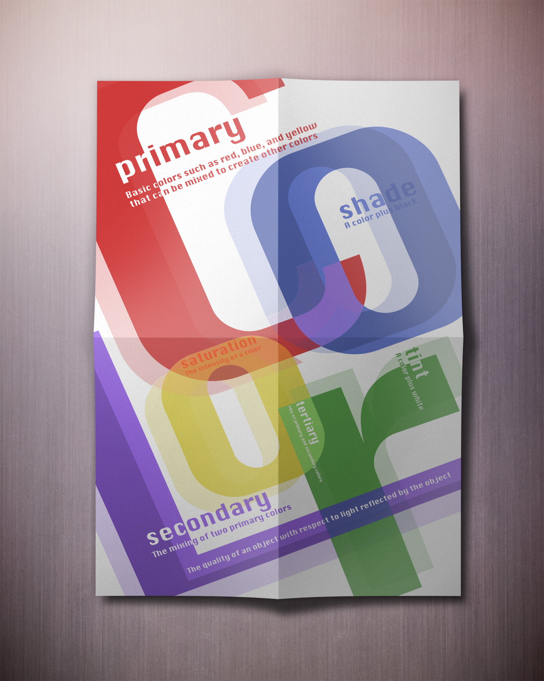 This color poster experiment showcases and explains certain characteristic of different types of colors. The elements in the posters shows aspects of those colors by the way they overlap to create other colors.